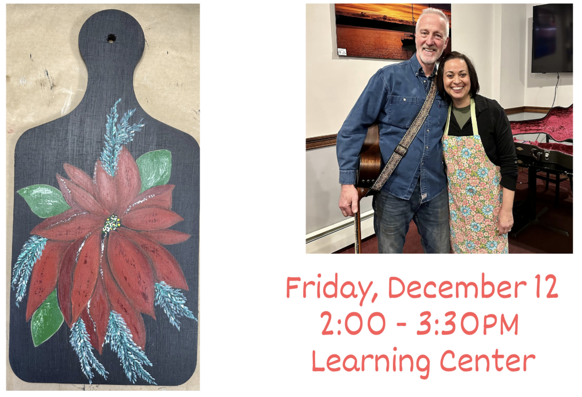 Bobby and Kellyn are a very special couple with a calling to create, teach, and build community through artistic expression. During this unique event Kellyn will teach us how to paint a poinsettia on a wooden canvas, while Bobby will serenade us on his acoustic guitar! Join us for this creative class you will never forget! Beginners are welcome no experience is necessary. There is no fee for this class and supplies will be provided, but registration is required.
